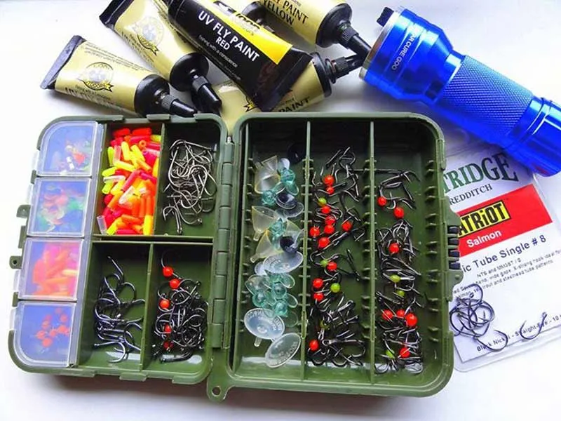 Various hooks - singles, doubles and trebles - some with hot spots - and junction tubes as well as some disks and propellers to mount in front of the fly for action and even more turbulence.