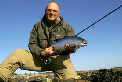 I waded out, far longer than we could usually go, and laid out the fly over a large weed patch. As it passed onto the sand I felt some nibbling, and on the following cast a small fish took the fly.